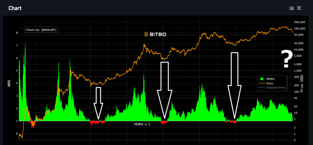 出典:BitBo(https://charts.bitbo.io/mvrv/) ?マークと下向き矢印は当サイトで記入