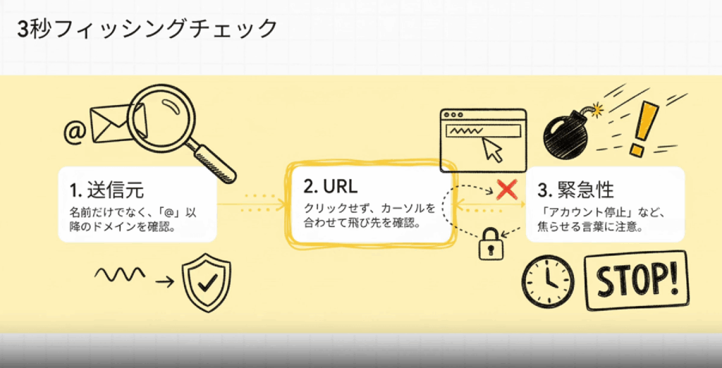 - 「緊急」「今すぐ」「限定」は詐欺のサイン