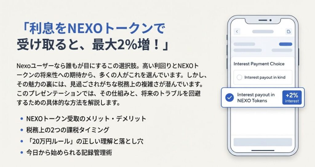 はじめに:NEXOトークン受取の魅力と税務の複雑さ